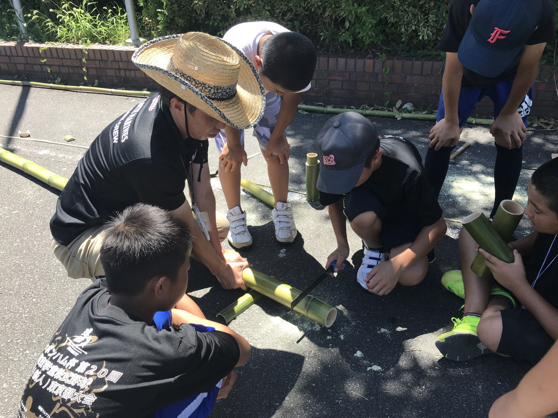 地元の農家さんのご指導により、まずは流しそうめんの道具作りに挑戦! みんな汗をかきながらも楽しそうに工作。