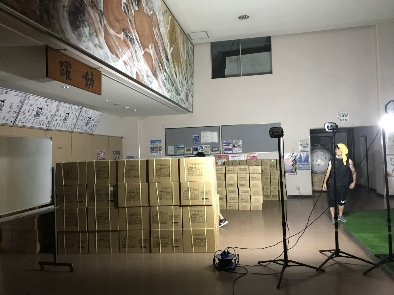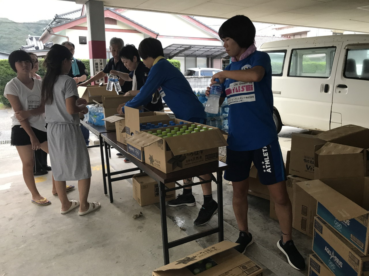 市の配給ポイントでもある天津小湊公民館に到着すると、地元消防団、さらにオルカ鴨川の選手たちも市の職員と一緒に住民たちに物資を配布していた。