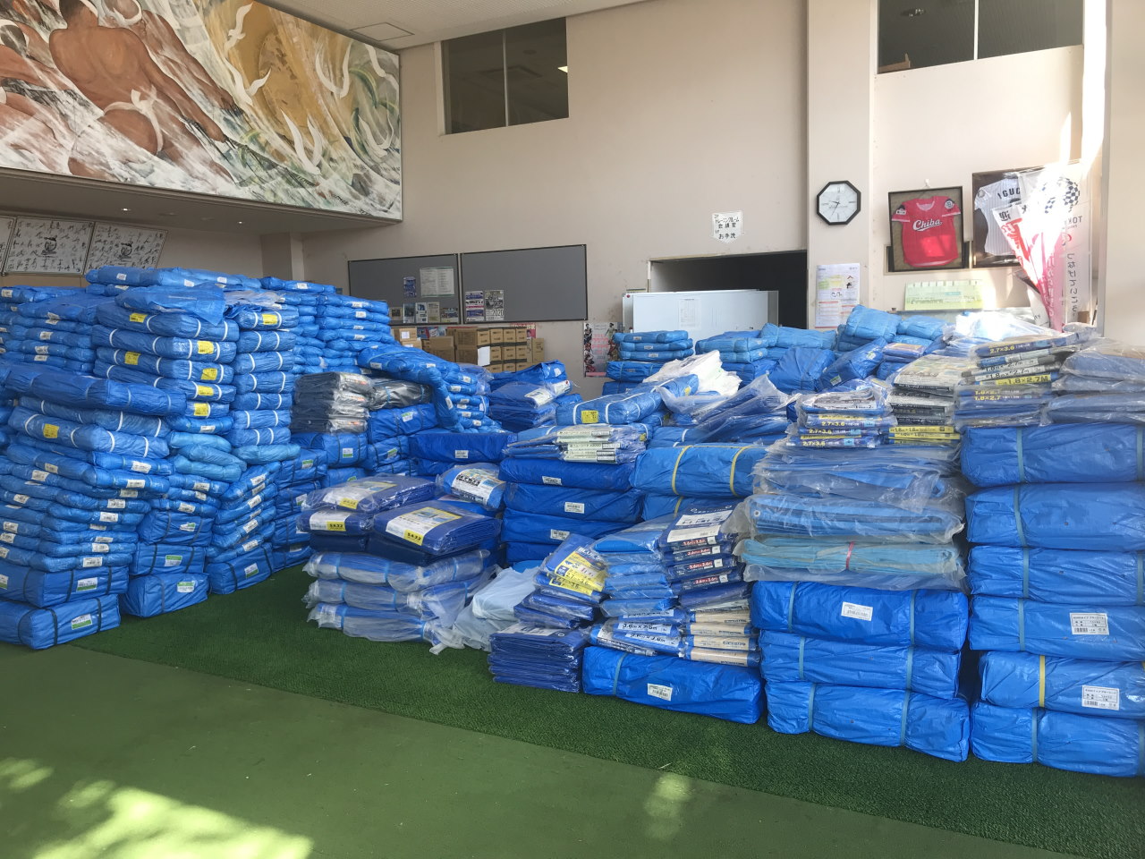 おかげさまで全国より、公私を通じて大量の支援物資が届いており、水や食糧、ブルーシート類も整いました。