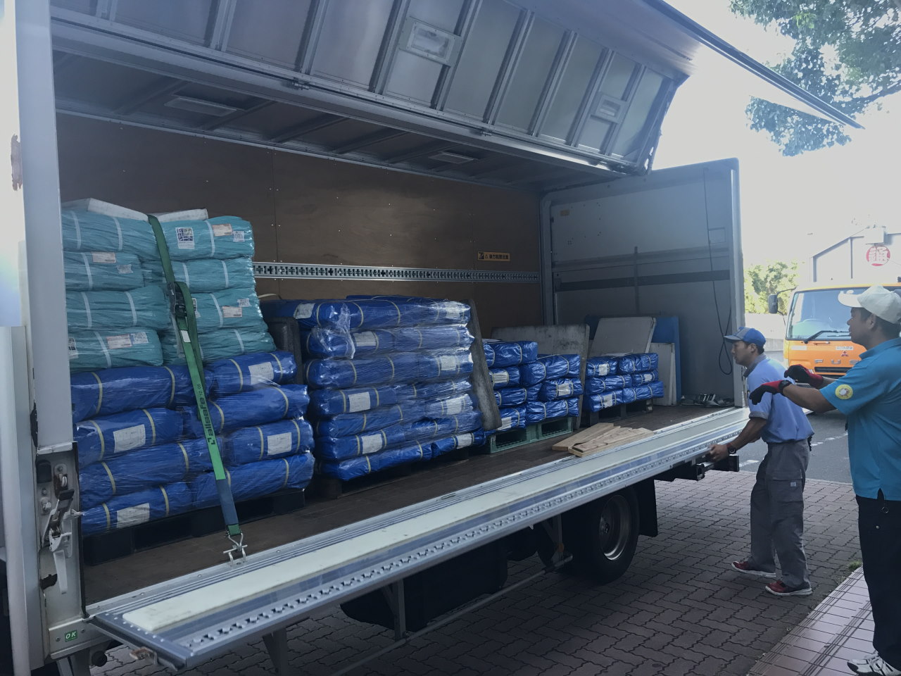今週は食品の物資から、ブルーシートや土嚢袋、ロープなどの屋根を応急処置する備品が多く届いている。今日は政府からの支援ということで、ブルーシートや土嚢袋が大量に届いた。