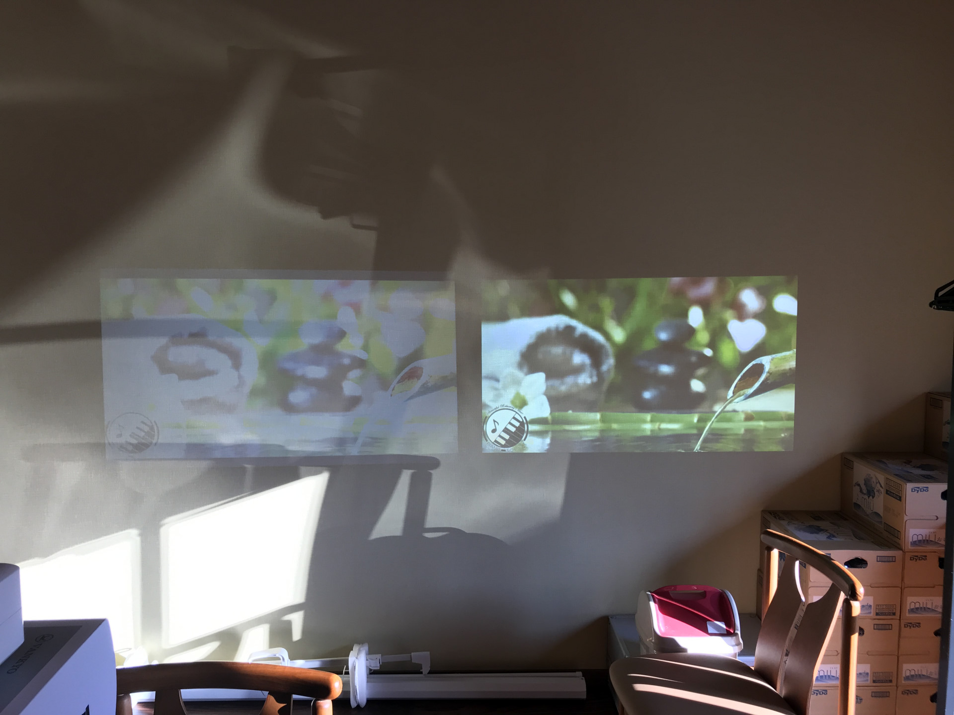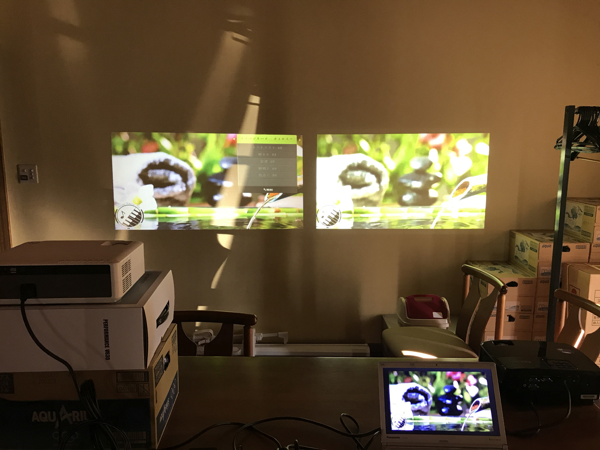 [写真:明らかに既存のBENQの3000ルーメンのプロジェクターより暗い。ANSIルーメンとルーメンの単位の違いなのか……。やっぱり安物は安物だった……。(左:VANKYO V630 右:BENQ)