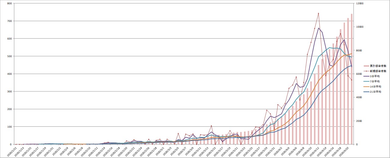 今回、3日平均、7日平均、14日平均、21日平均を算出し、それぞれグラフ化してみた。