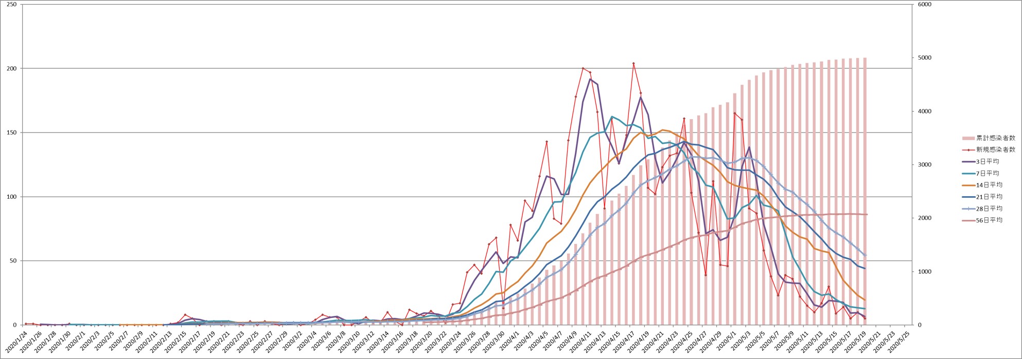 [写真:日本の感染者推移:明らかな下降トレンドになっている。平均線を見ると、おそらく4月5日以降数日間で感染した人が最も多いのではないかと推測される。緊急事態宣言は悪いタイミングではなかったかもしれない。