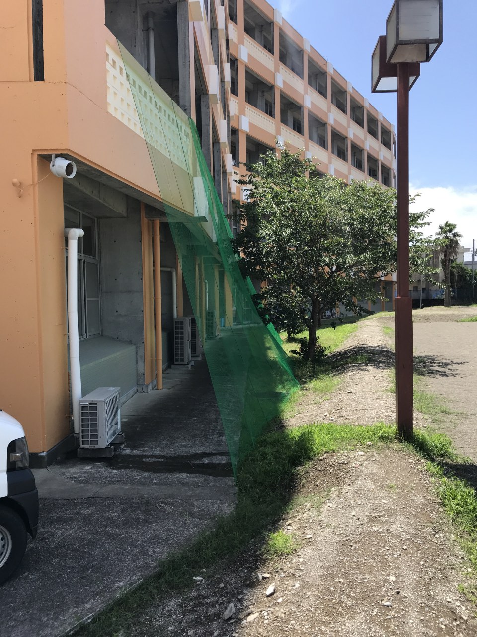 [写真:校舎の窓を保護する防球ネット