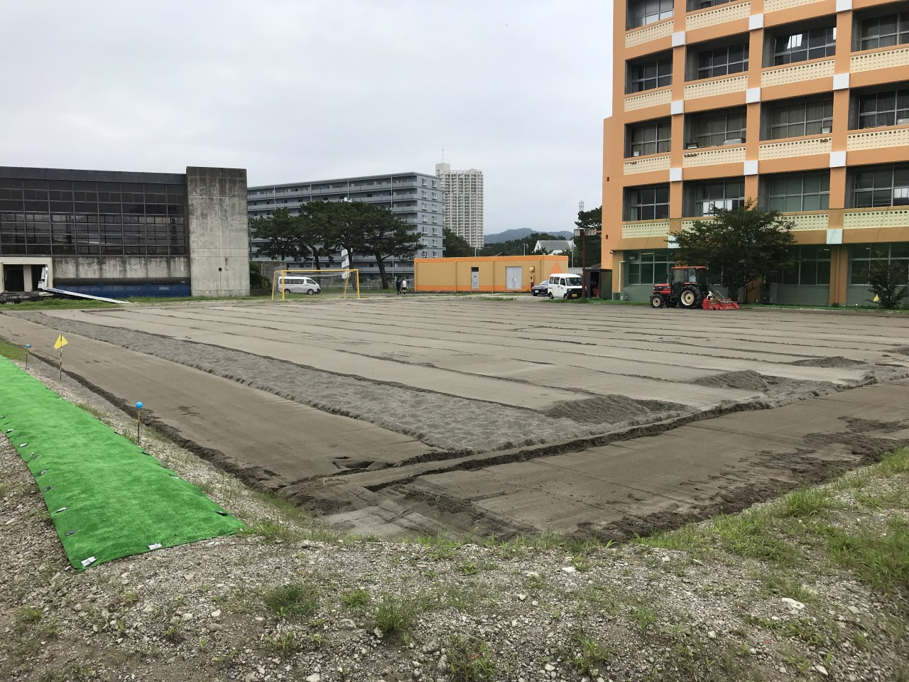 午前中、地元農家さんの協力を得て、トラクターをビーチコートに入れて砂をふかす。