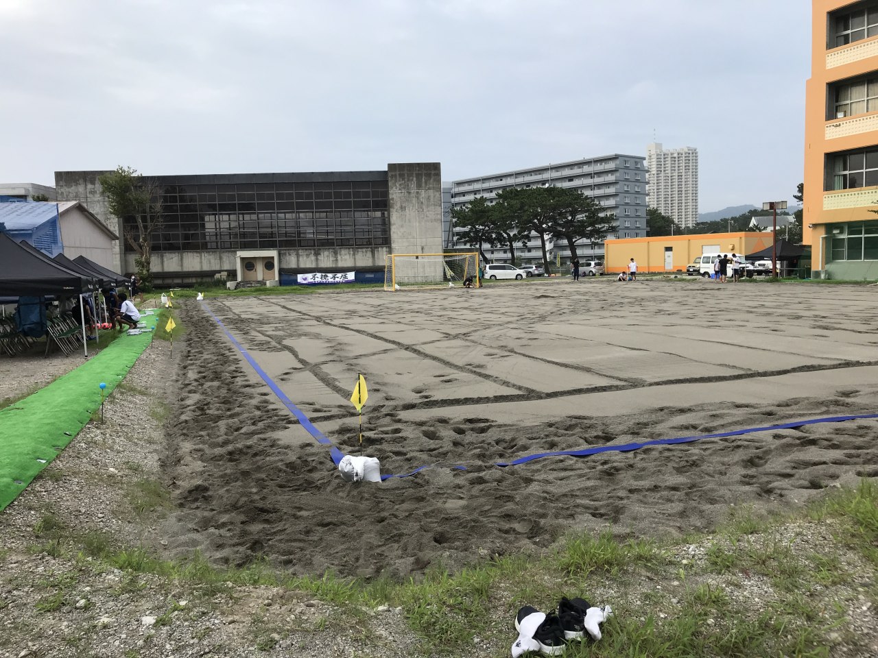 ビーチコートではラインテープを張り、フラッグを立て、周辺にはベンチ、オフィシャルテントを設置。レフェリーエリアも確保。防球ネットも4箇所ほど仮設した。