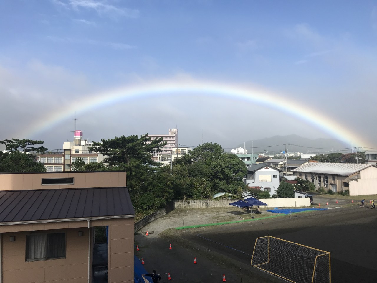 朝から青空が広がり、なんと、見事な虹のアーチが鴨川の空に架かっていた。