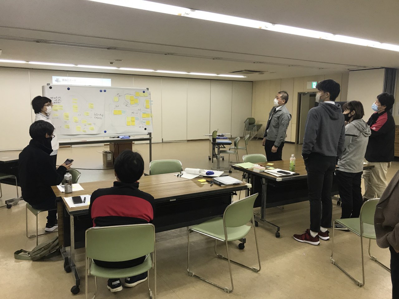 ウェルkamoCAFEではアイディアの作り方について渡辺先生の講義を受けた後、ワークショップではブレインストーミング+KJ法を活用して、「自分にとっての幸せ」をテーマに2グループに分かれて話し合った。
