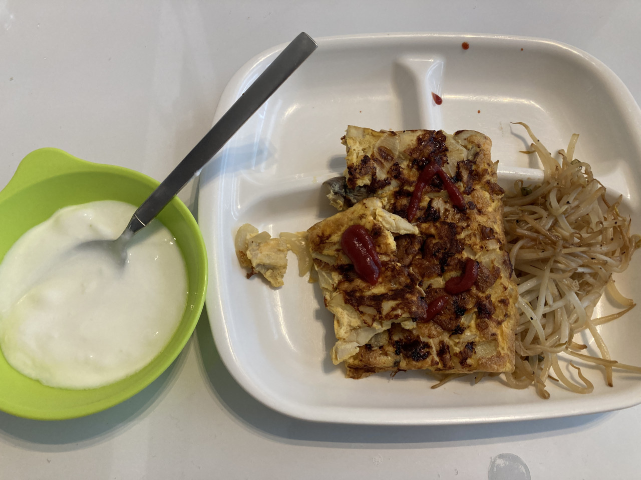 [写真:今日の朝食。見た目は悪いけど、子どもたちは完食していた。。。(^^)