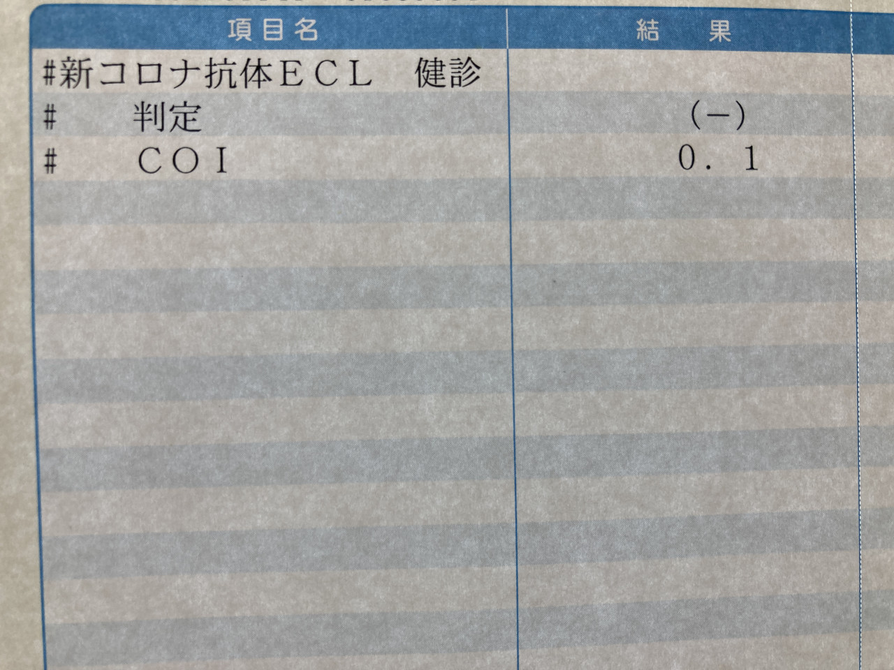 [写真:先日の健診でオプション受診した、新型コロナの抗体検査結果は「陰性」ということは、罹ってもないし、罹ったこともないってことか…。