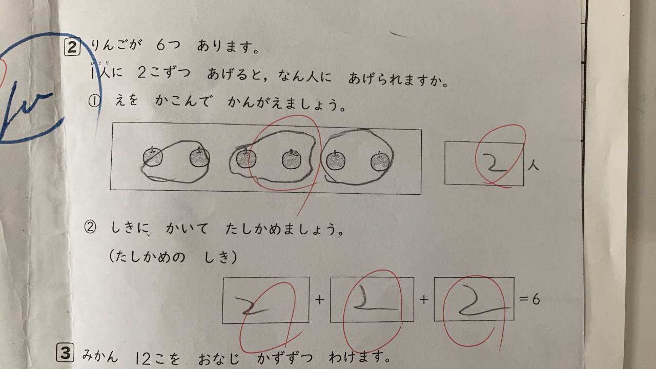 (1) りんご6つを1人に2こずつあげると、なんにんにあげられるか?
