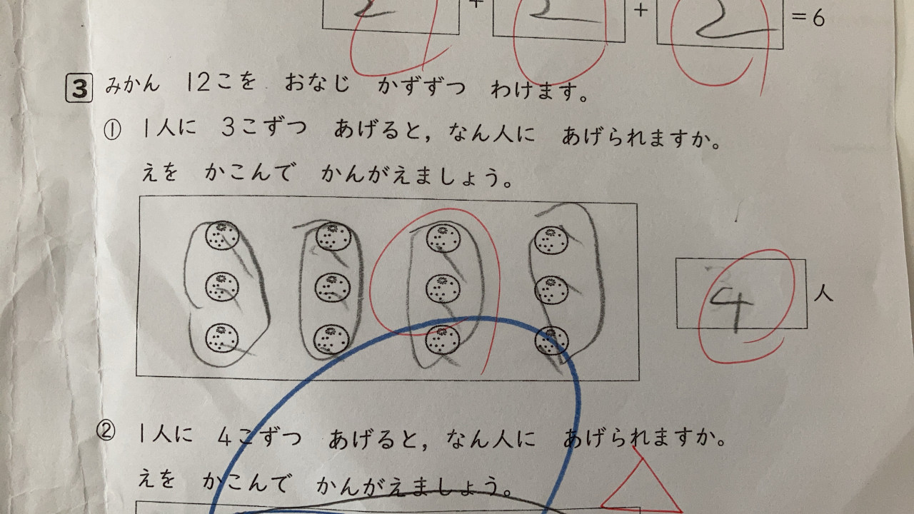 (2) みかん12こを1人に3こずつあげると、なんにんにあげられるか?