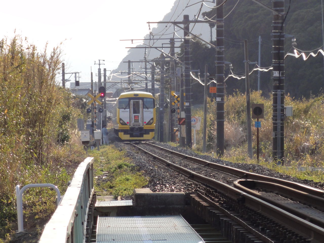 [写真:神社の前で半日以上停車を余儀なくされた「わかしお」号。神社は一次避難場所として提供した。
