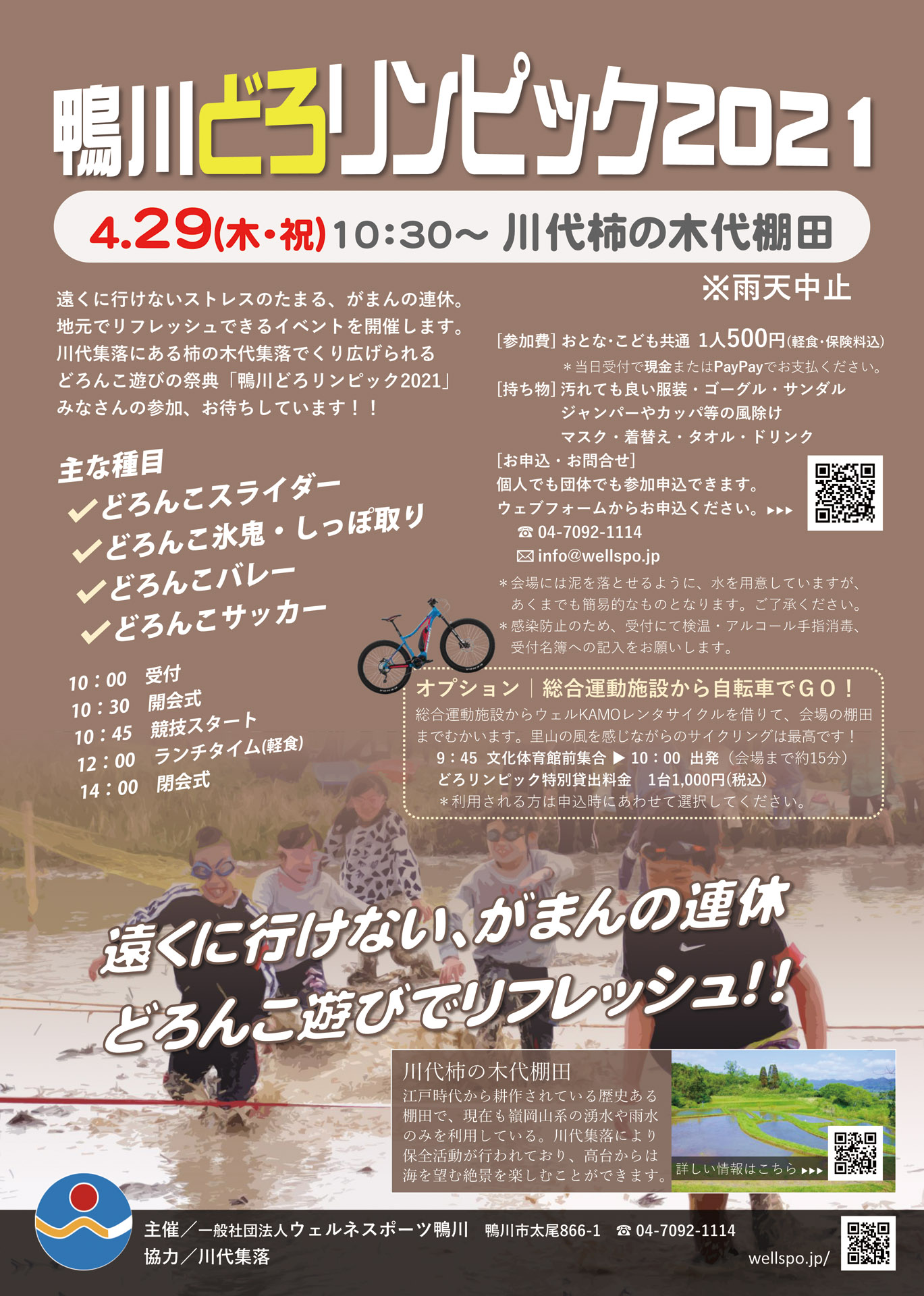 急遽、川代集落のみなさんと開催を決めた、4月29日(木・祝)の「鴨川どろリンピック2021」へ向けて、チラシを作成し、印刷発注! 来週月曜には納品され、学校にも配布する予定。