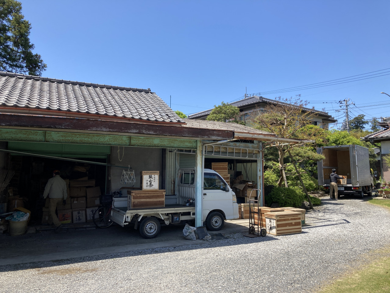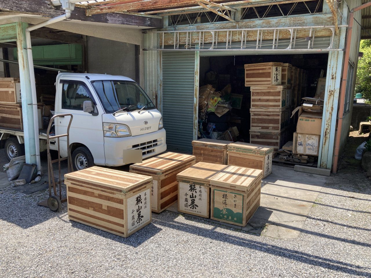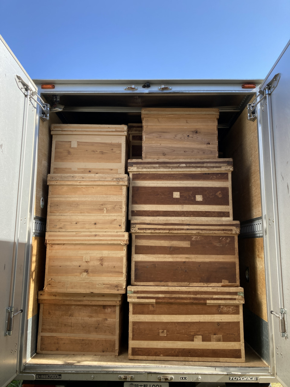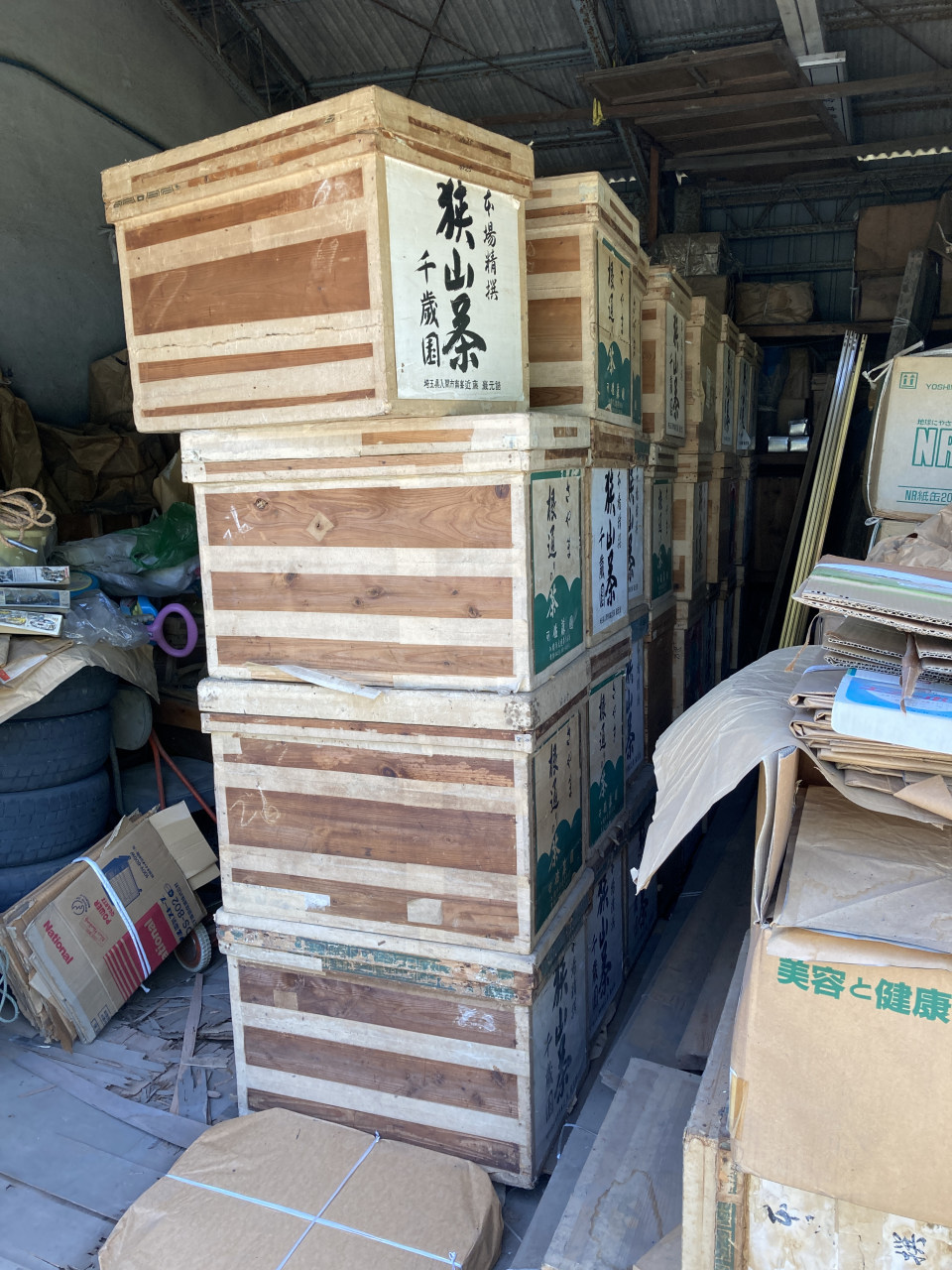 大きな茶箱を19箱、中くらいの茶箱を41箱ほど提供いただき、2tトラックの荷台はいっぱいに。