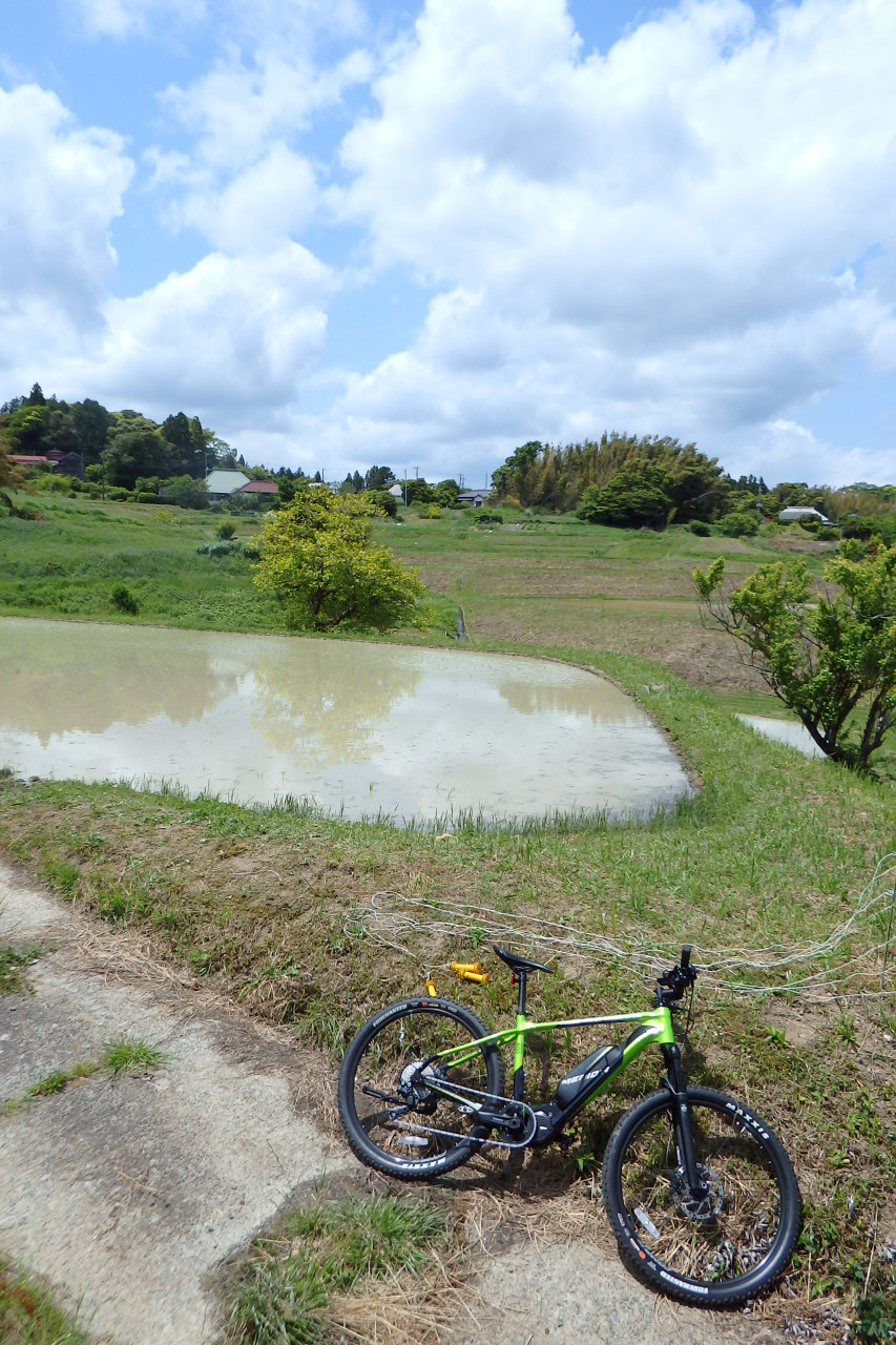 農家さんを後にすると、自衛隊レーダー基地の前を通り、太田代の集落へ下って、田植えが終わったばかりの田園の中を風を切りながらe-bikeを進め、古泉園さんへ。
