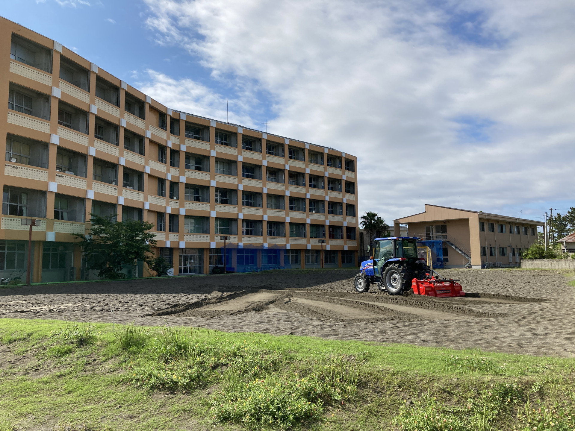 朝8時に農家さんに来ていただき、トラクターでサンドコートをふかしていただく。