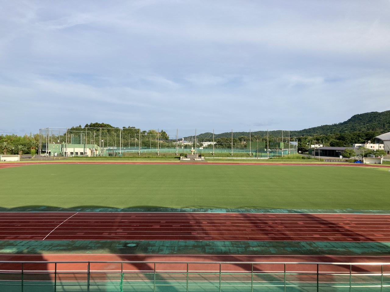 [写真:緑色になってきた芝生養生中の陸上競技場