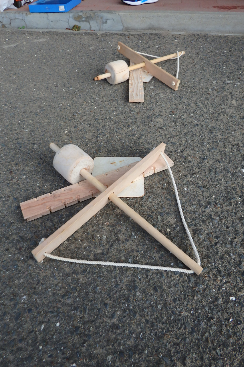 郷土資料館の方のレクチャーを受けた後、グループグループごとにわかれての弓切り式火起こしに挑戦するが、、、やはり、なかなか火は起こらない。煙が出るところまではいくが……、その先はなかなかうまくいかない……。