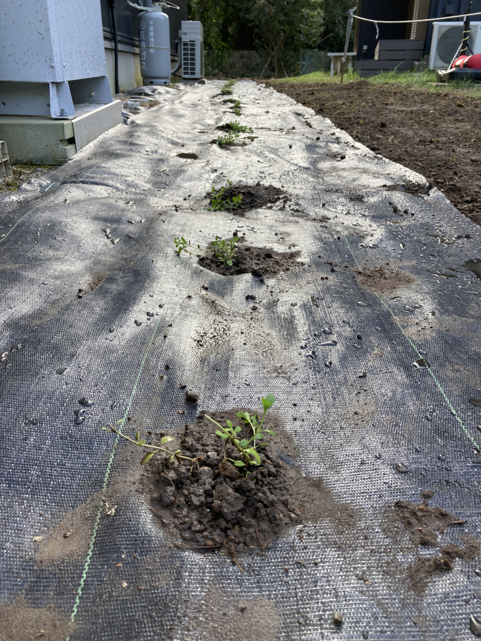 今回敷設した防草シートは一番安いグレードのため、下から草は生えにくいが、上からは根を通しやすいという性質があることがわかり、防草シートのところどころに穴を空けて、リピア(ヒメイワダレソウ)のポット苗を植栽してみた。