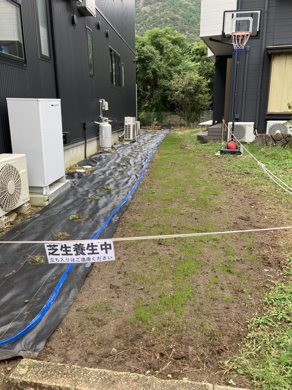 さて、宿坊緑化大作戦は、芝生がここ数日雨模様でさらに気温も低くなったことで、一斉に芽吹き始めた。