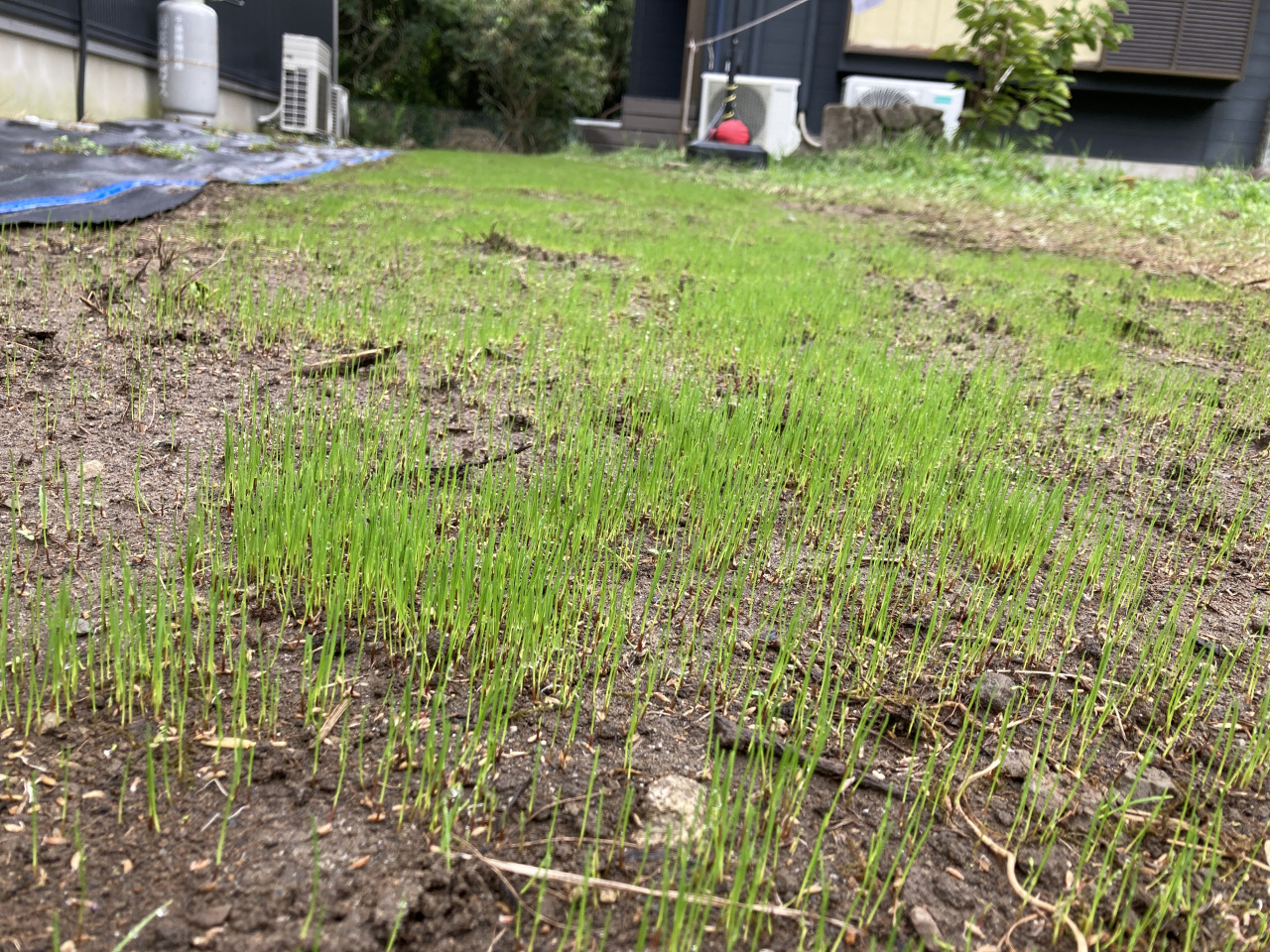 今回はしっかり下準備をした芝生の種を蒔いたわけではないので、とってもまばらな発芽ではあるけれど、ここ数週間は踏みつけないようにガマン、ガマン。