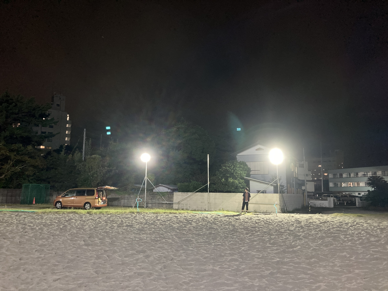 1週間ほど取組んできた、鴨川令徳ビーチコートのいわゆる「バックスタンド」側のナイター照明の設置作業がようやく完結した。先日一度立てた照明の角度などを微調整して、再び立て直し、また、点灯もスイッチ一発で簡単にできるようにした。