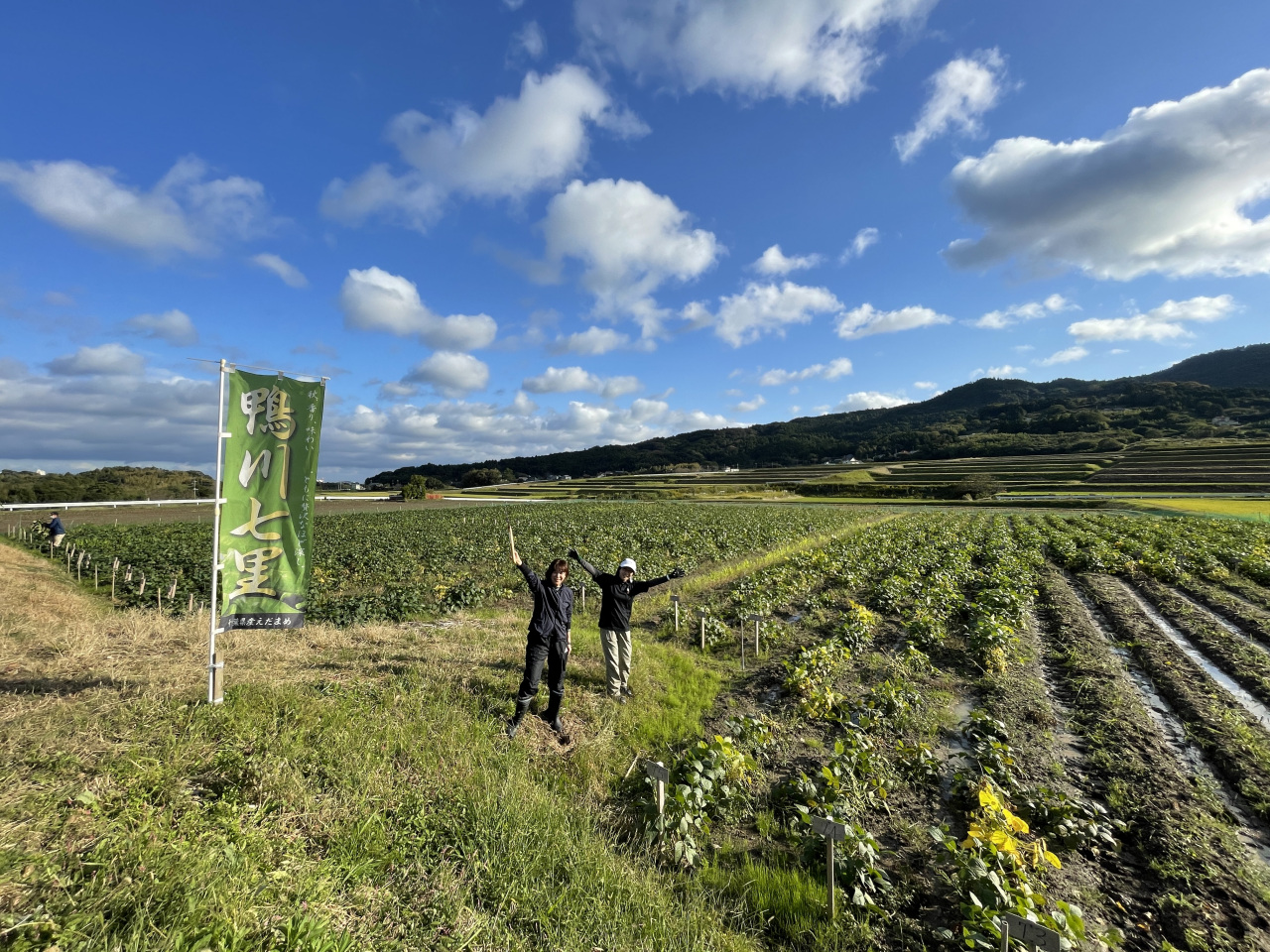 朝一でミーティングをした後、夕方、ウェルスポスタッフとともに、収穫時期を迎えた鴨川七里狩りに下小原の圃場を訪れた。