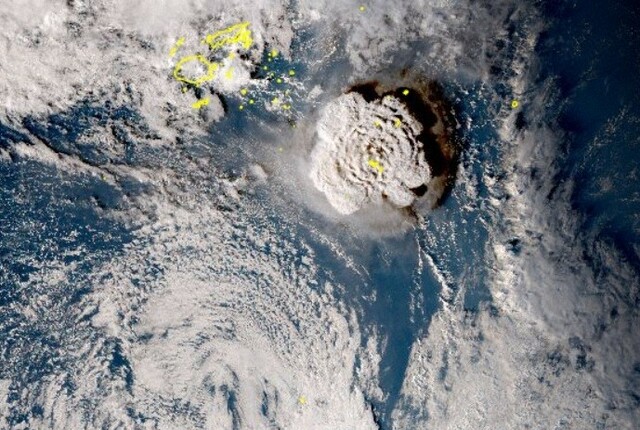 [写真:大規模噴火の噴煙をとらえた衛星画像