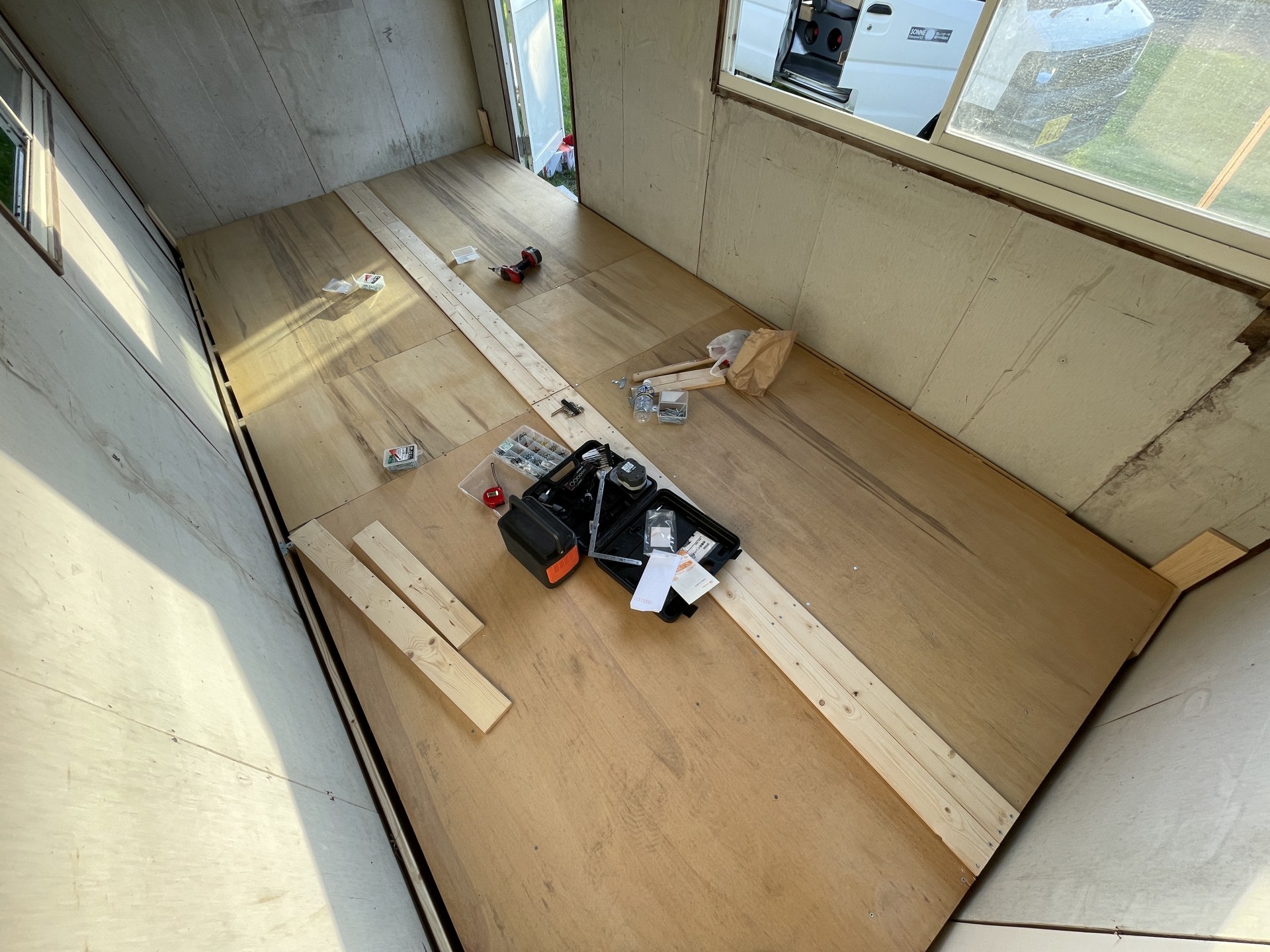 先週、傷みの激しい方に床をつくったのだが、どうも強度に難があるので、一度床をはがして補強することにした。4時間ほどインパクトを打ち続け、、、汗だくのヘトヘト。