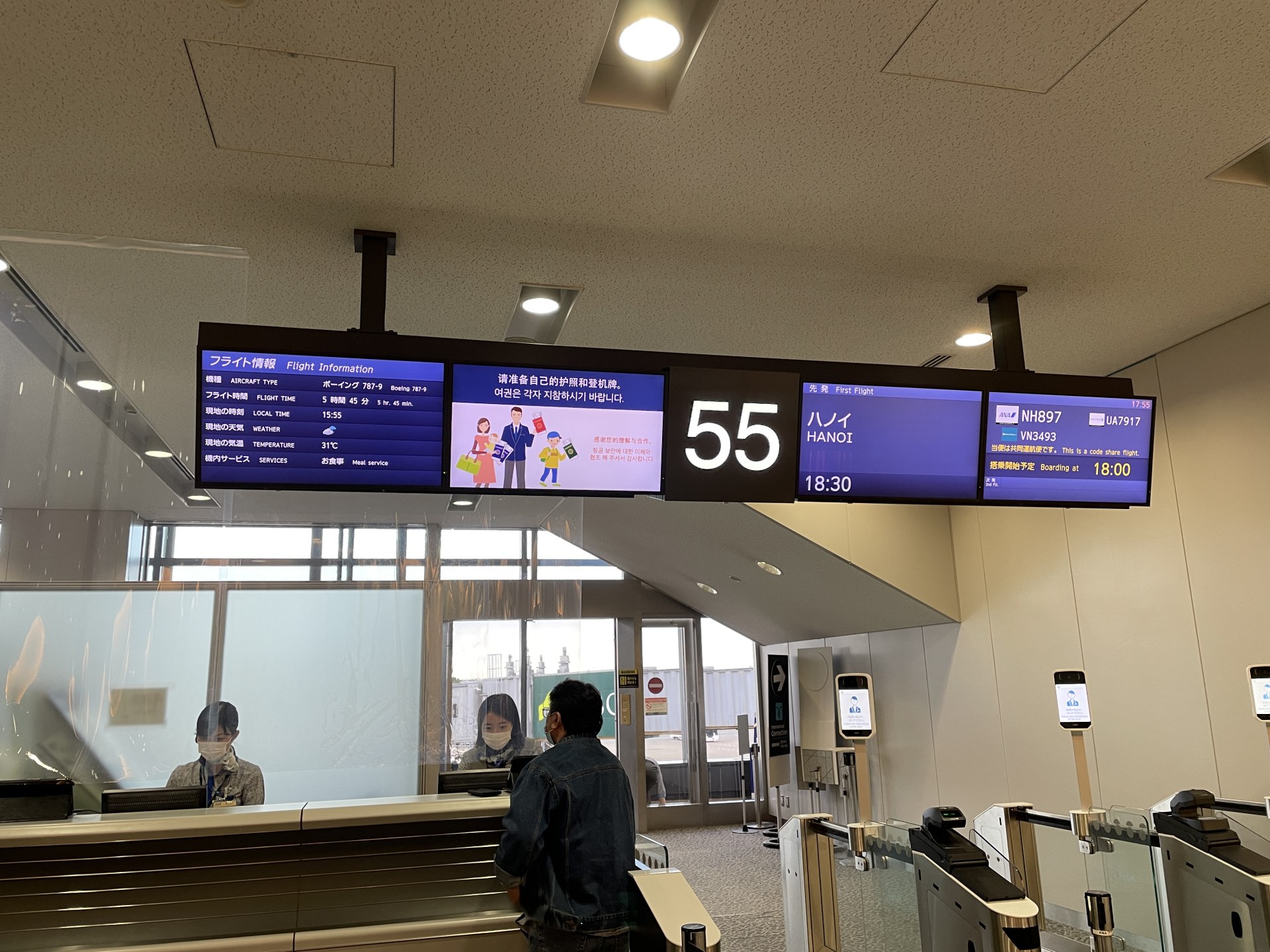 いまでは出国は自動化され、基本的に無人での対応。ただ、パスポートに出国スタンプは押されないので、希望する人は係員が押してくれる。長男にとって、初めてパスポートを使うこともあり、記念で押してもらった。