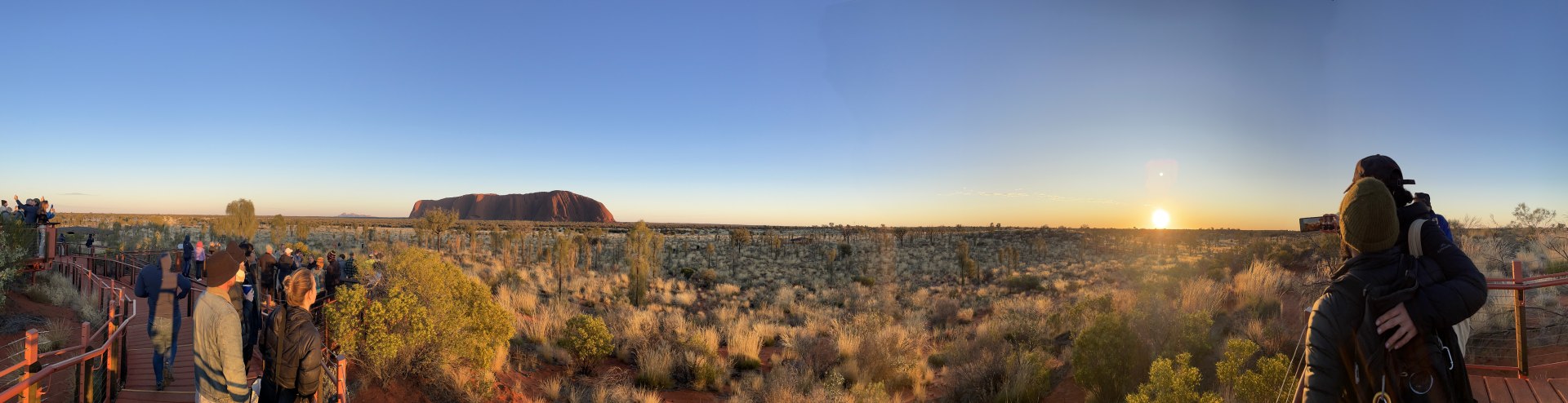 この日の日の出は午前7時19分。地平線から朝陽が昇り始めるとともに、ウルルが輝き始めた。