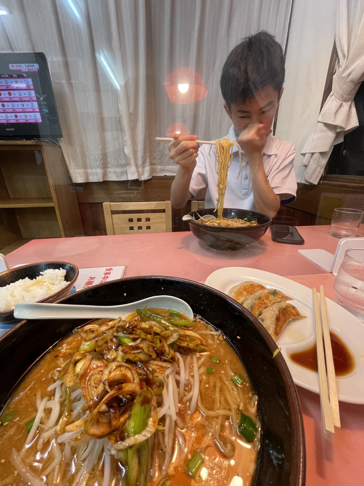 [写真:ラーメン党の長男と。とん太の味噌ねぎラーメンは最高!