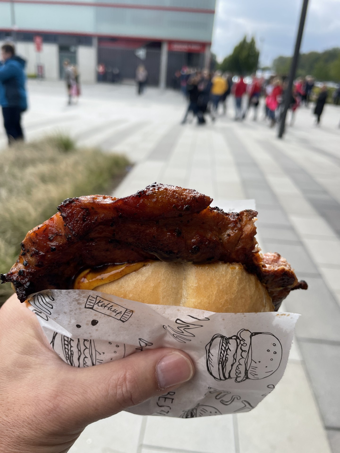 試合会場に到着すると、お昼を食べていなかったので、ボリューミーなステーキサンドを頬張って腹ごしらえ。