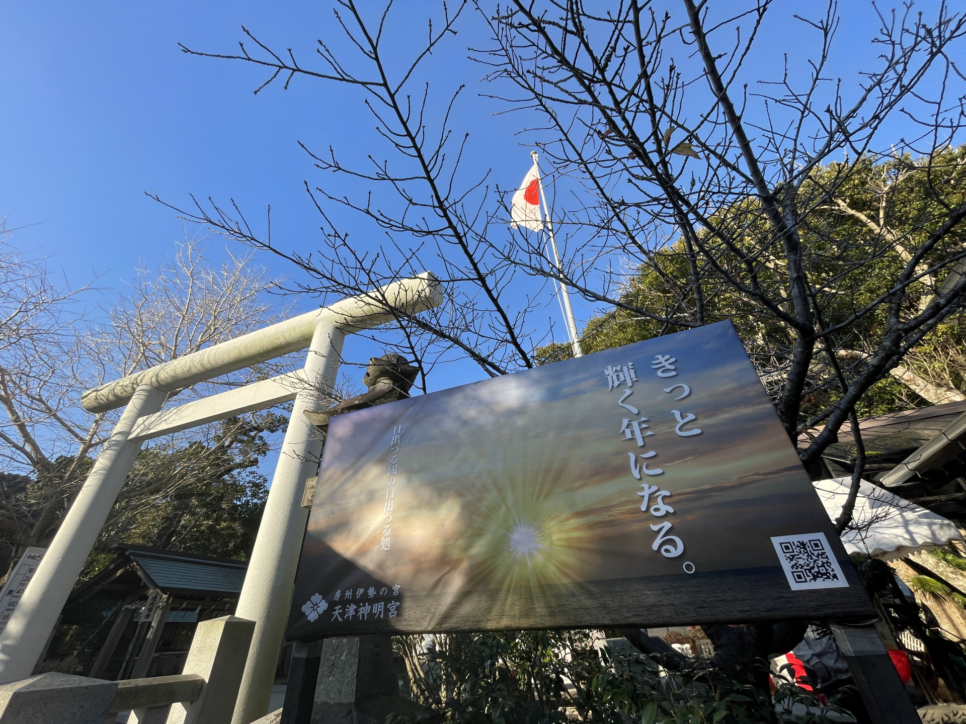 午後、境内入口にある看板を新年仕様に幕を付け替える。