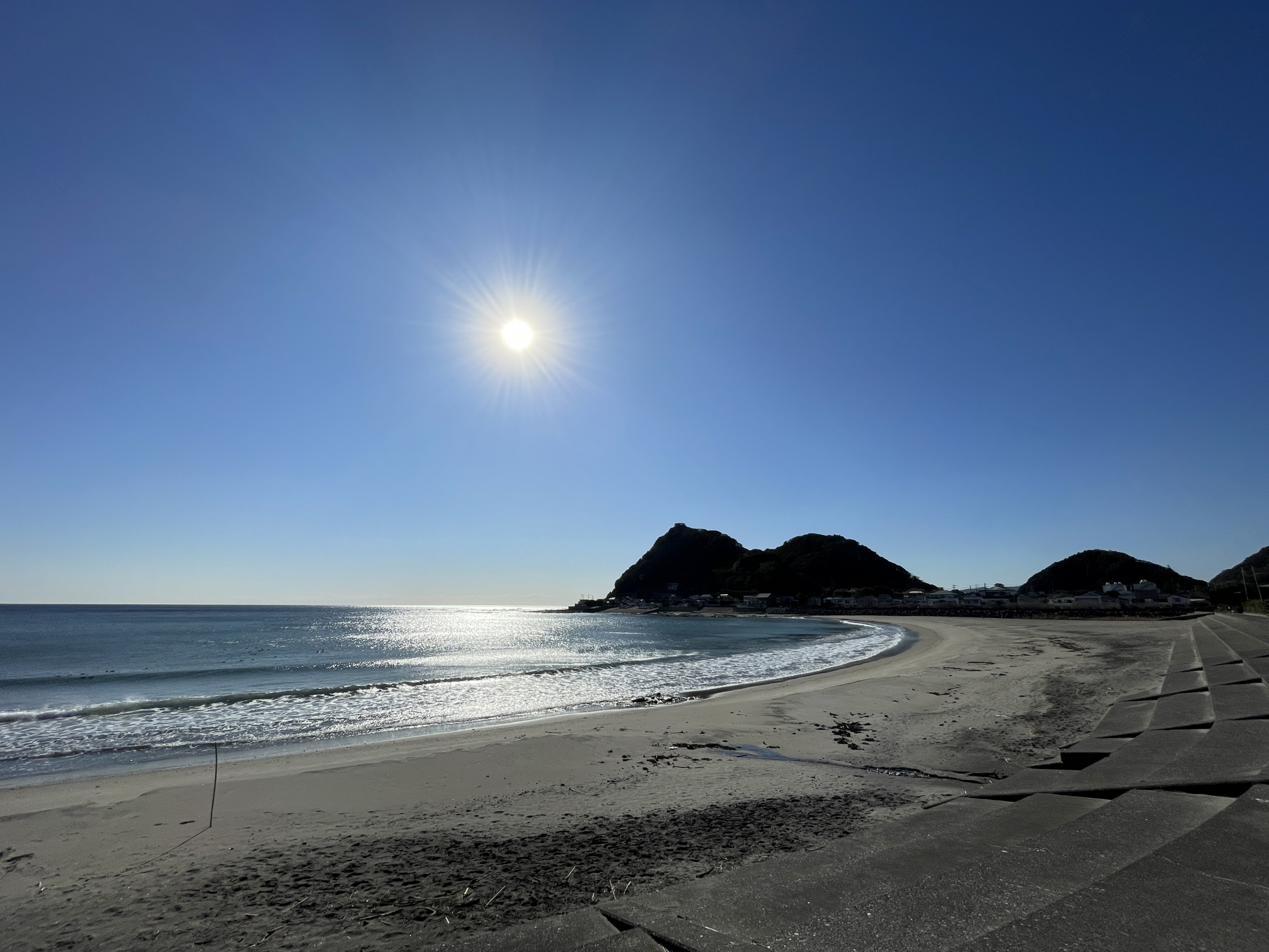 [写真:輝く太陽に青空、青い海、冬でも美しいニタ間海岸