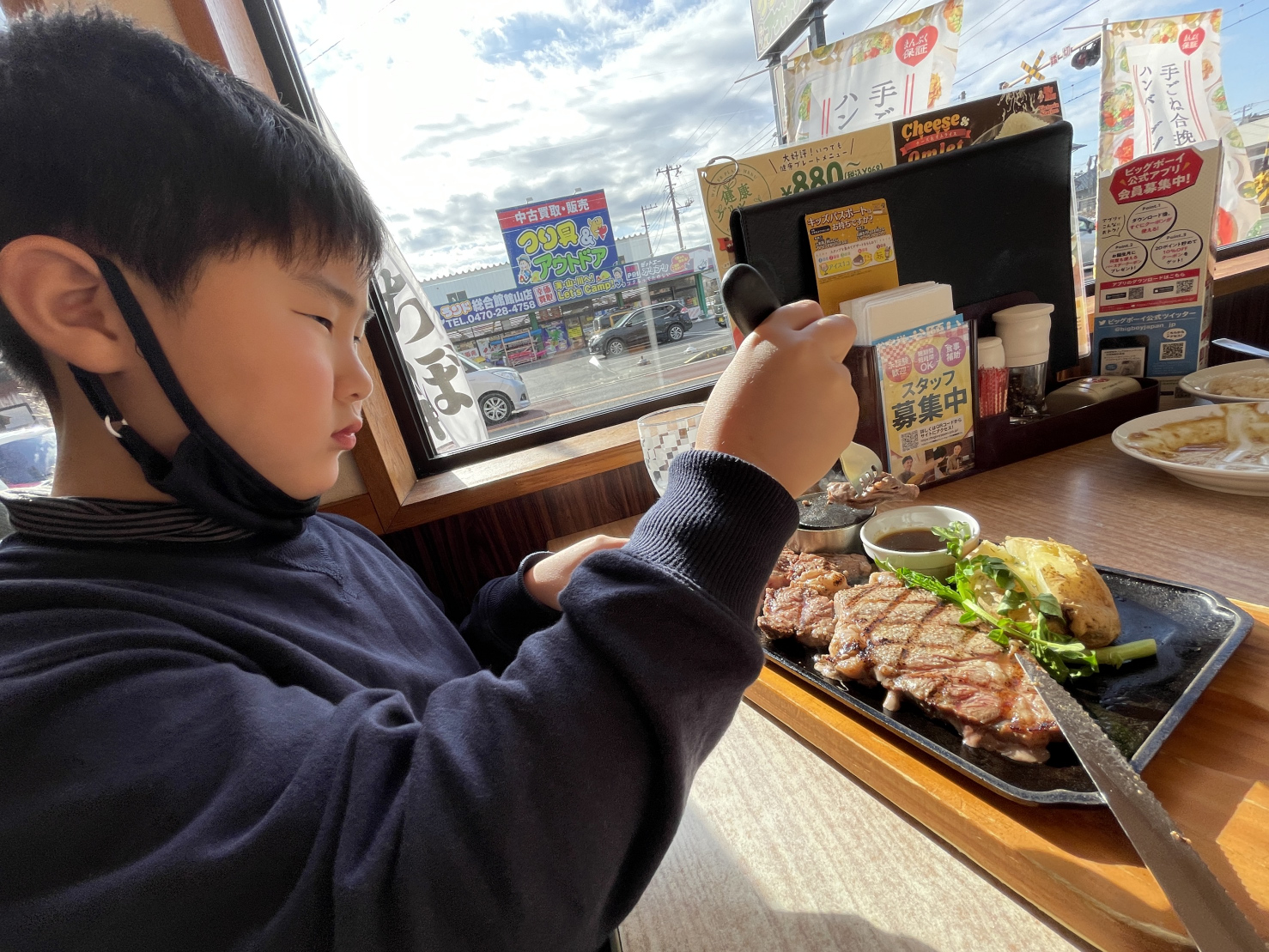 その後、いぶたん、たっての希望でビッグボーイへ行き、朝10時からステーキタイム。