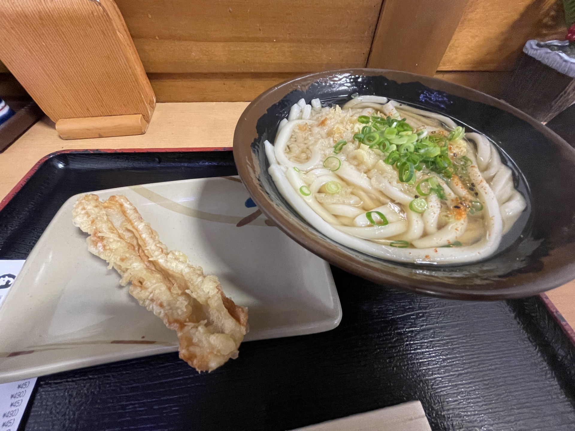夕飯は無難に、近くのうどん屋さんで、かけうどん+ちくわ天。