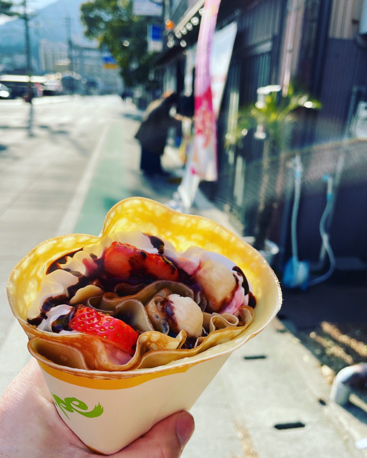 和三盆のソフトクリーンを賞味した後、調子に乗って、琴平駅近くの道路沿いにあったステキなクレープ屋さんでクレームを買ってしまい、、、おそらく消費カロリー以上のカロリーを獲得したことは間違いない!笑笑笑