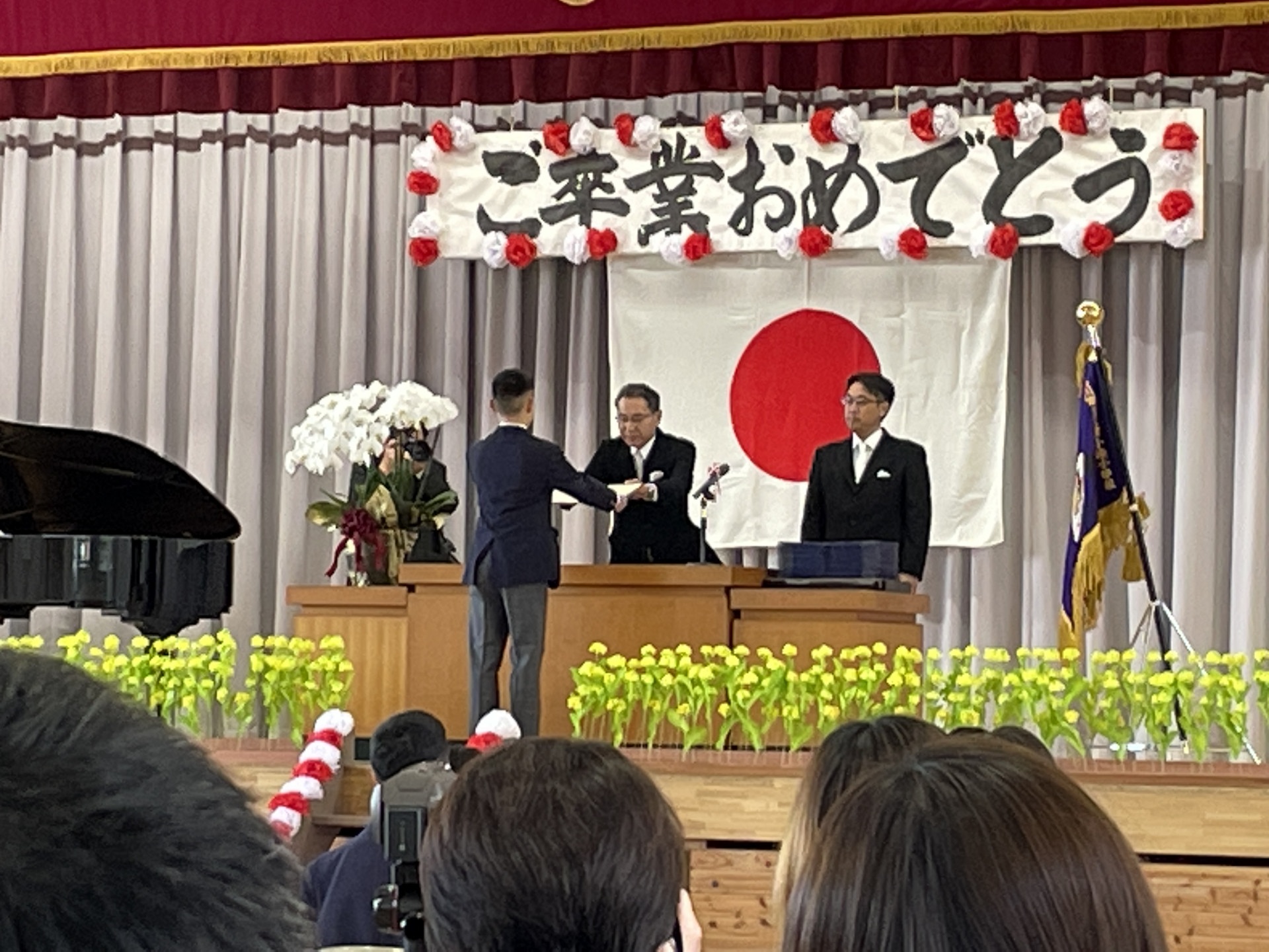 卒業生入場から始まり、卒業証書授与あり、門出の言葉あり、通例通りの次第になんだか安堵。