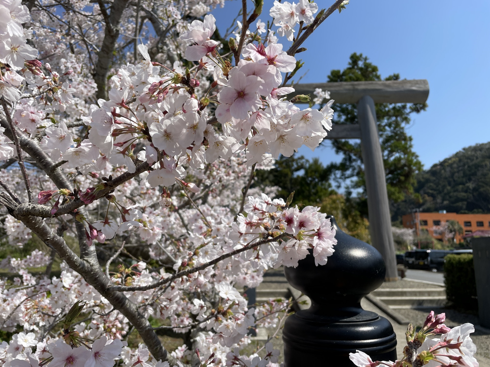 [写真:青空と鳥居と桜
