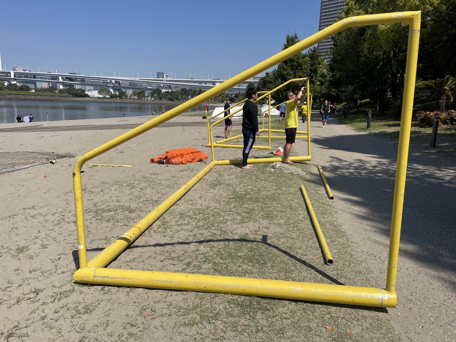20人近くのメンバーが集まり、3時間ほどかけて、防球ネット、ゴール、ラインテープを準備し、ビーチコートの設営を行った。