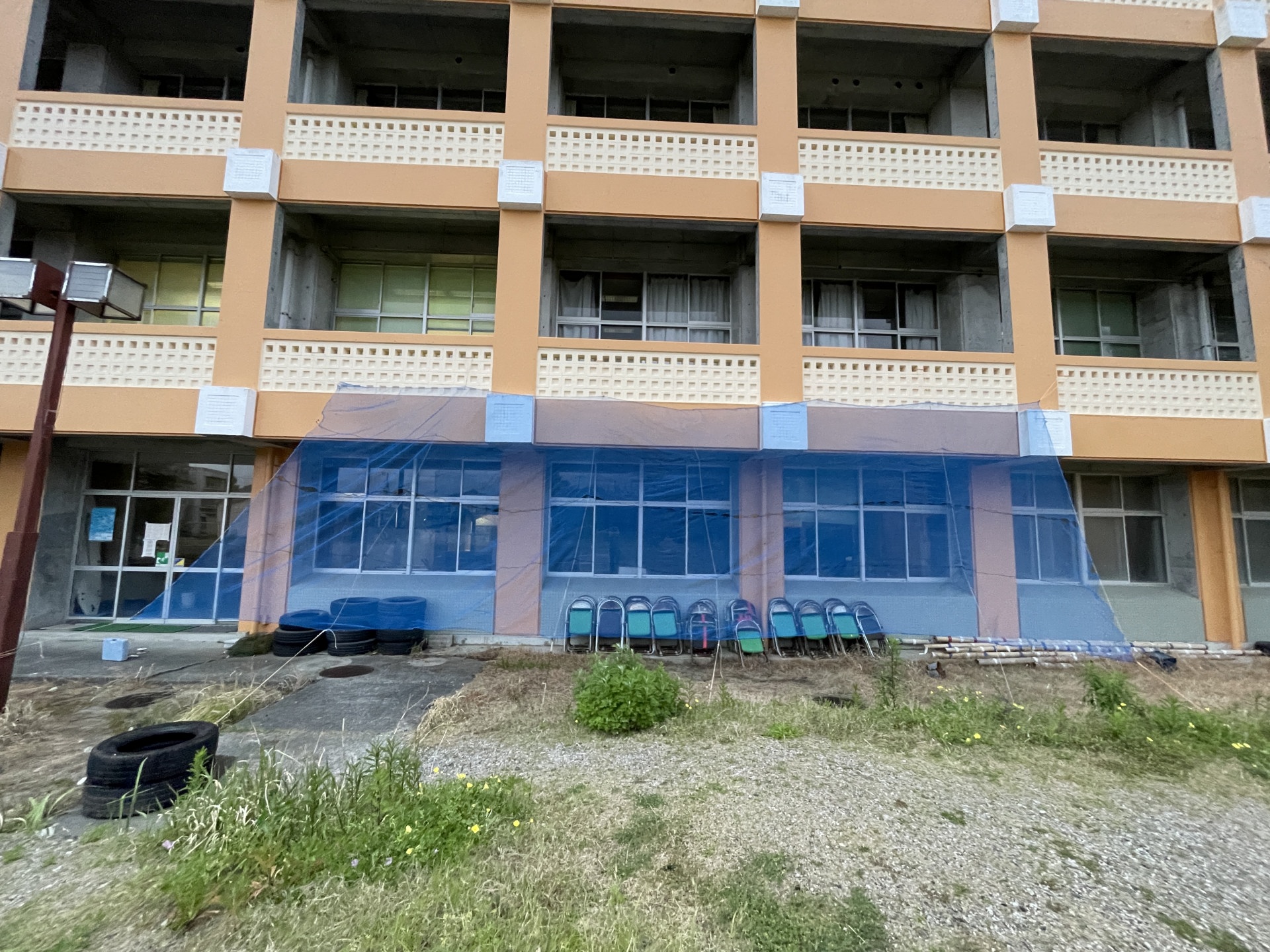 まずは今年初めの頃から垂れ下がってしまっていた、校舎の窓を守るための防球ネットを補修する。