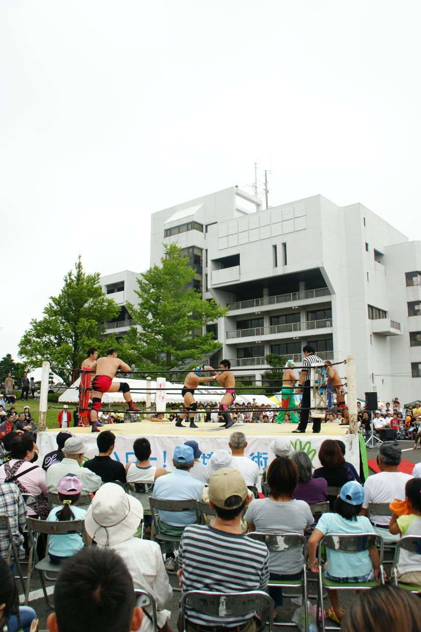 [写真:市役所前で前代未聞の復興チャリティプロレスを開催。これが自分のイベンターの原点でもある(2011年6月12日)