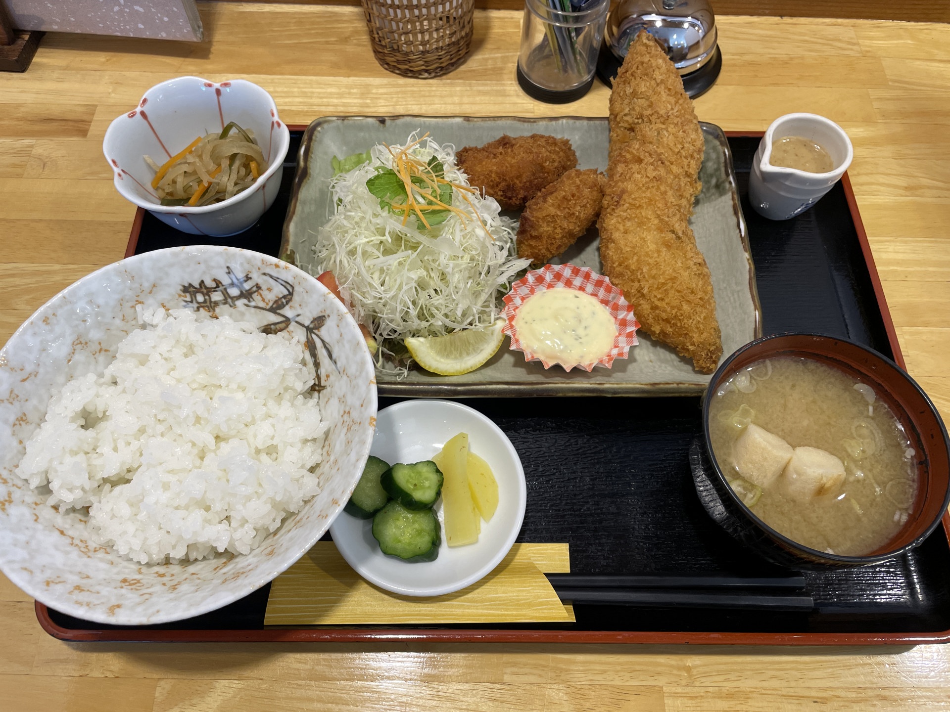 [写真:まつもと食堂のサーモン・カキフライ定食。揚げ方が絶妙でサクサク!