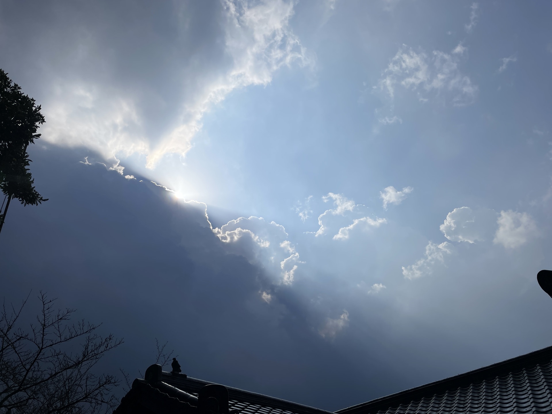 我々がお参りしていると突然強い雨が降り、数分後には晴れ間がのぞき、めまぐるしく天気が変わる幻想的な空模様。