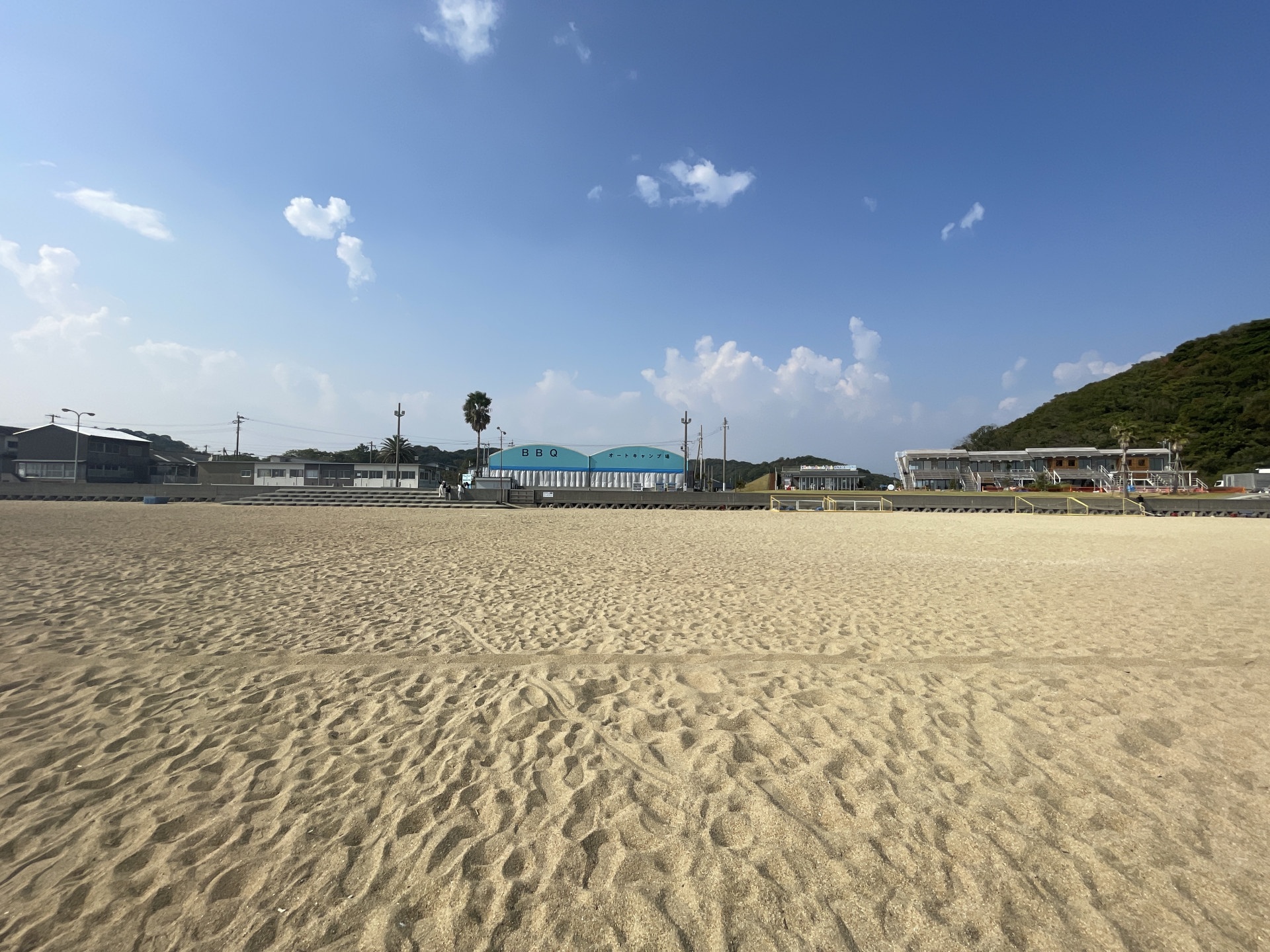 [写真:試合会場の長井浜海岸。砂は元の砂浜の上に人工的に足しているようだ。海岸沿いには商業施設も続々建設中。
