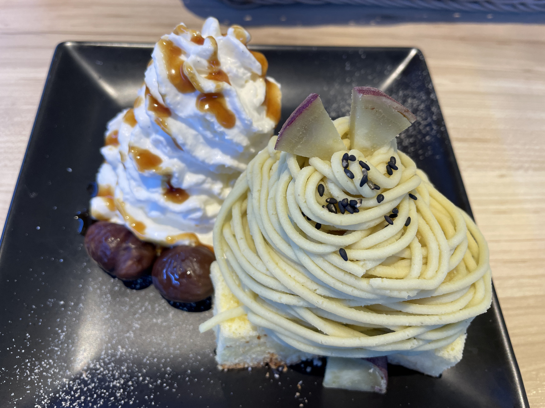 [写真:ランチはちかちゃん、はっちゃんとビーチカフェへ。調子に乗って、デザートも注文。モンブラン、くどくなく、栗の味がしっかりしておいしかった。
