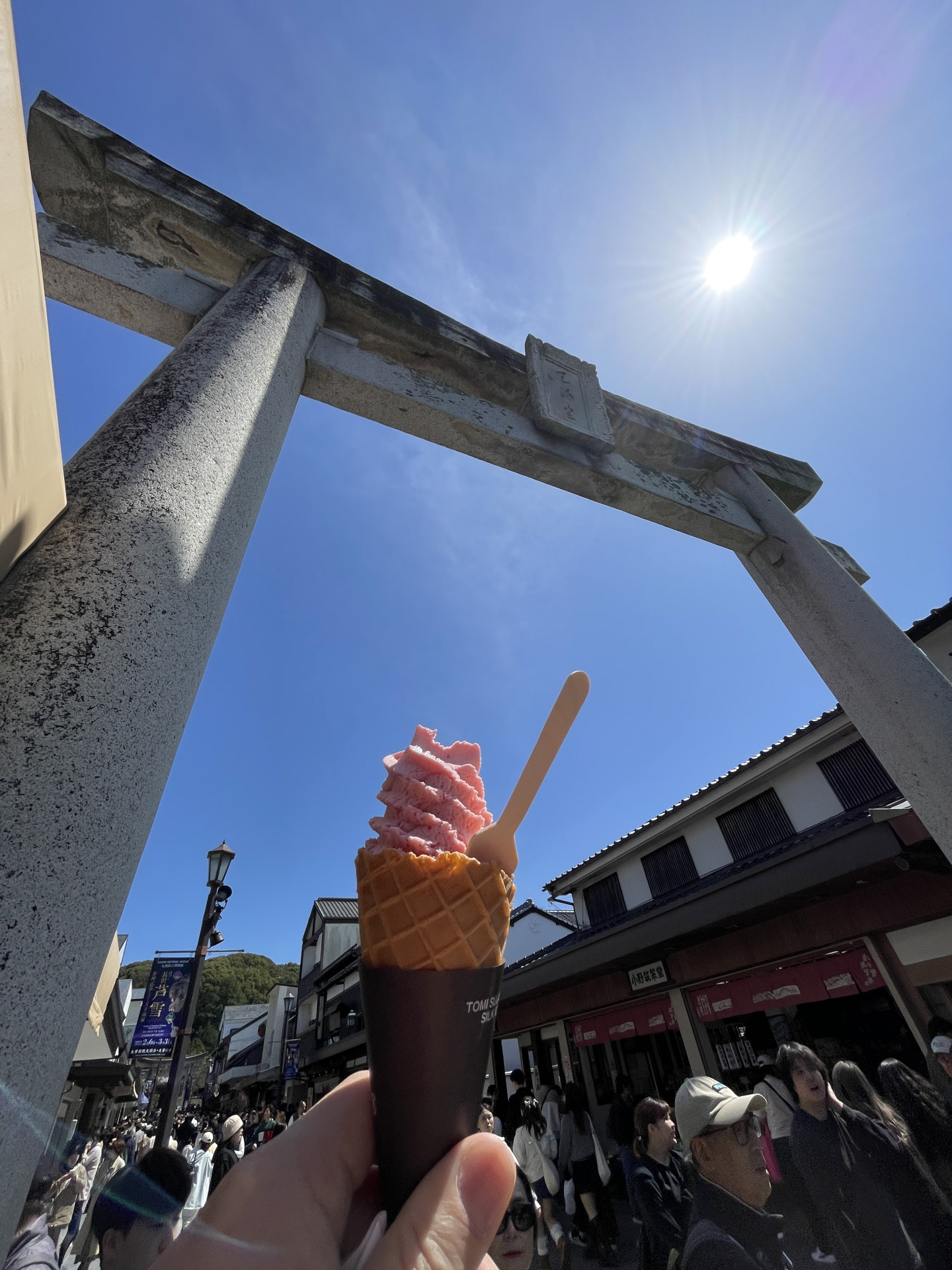 まさに門前町、伊勢神宮のおかげ横丁を思わせる町並みで、観光客はみな、お土産店を物色したり、スイーツなどを買い求めて食べ歩きしていた。