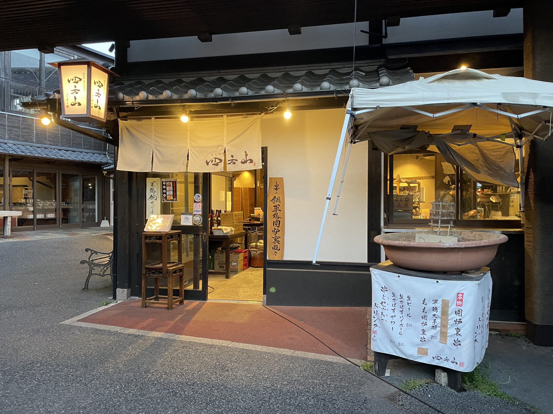 夕飯は近くの横丁にある、軍鶏鍋と炉端焼きのお店「四方山」さんへ。